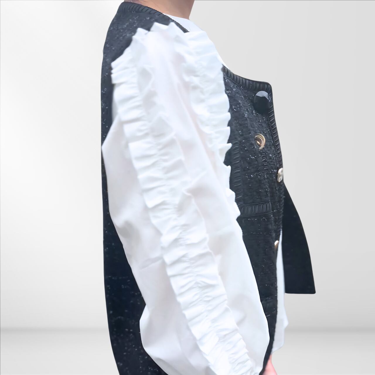 袖にあしらったフリルが、動きに合わせてやさしく揺れ、