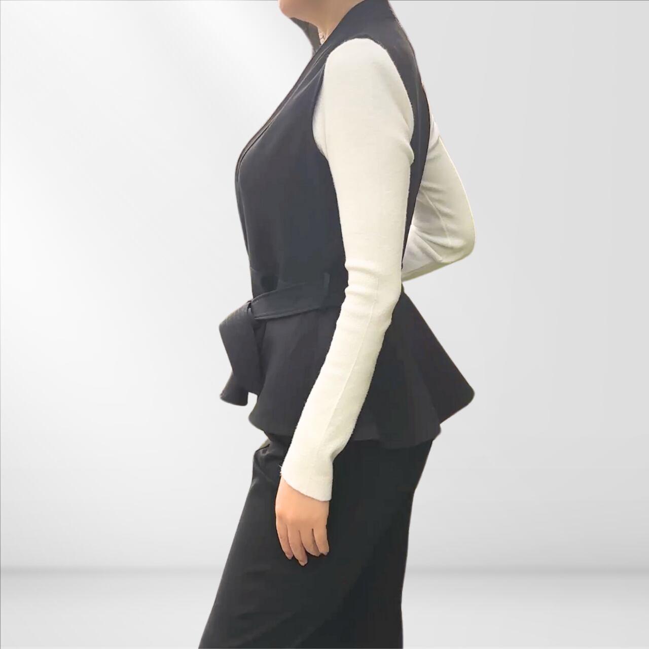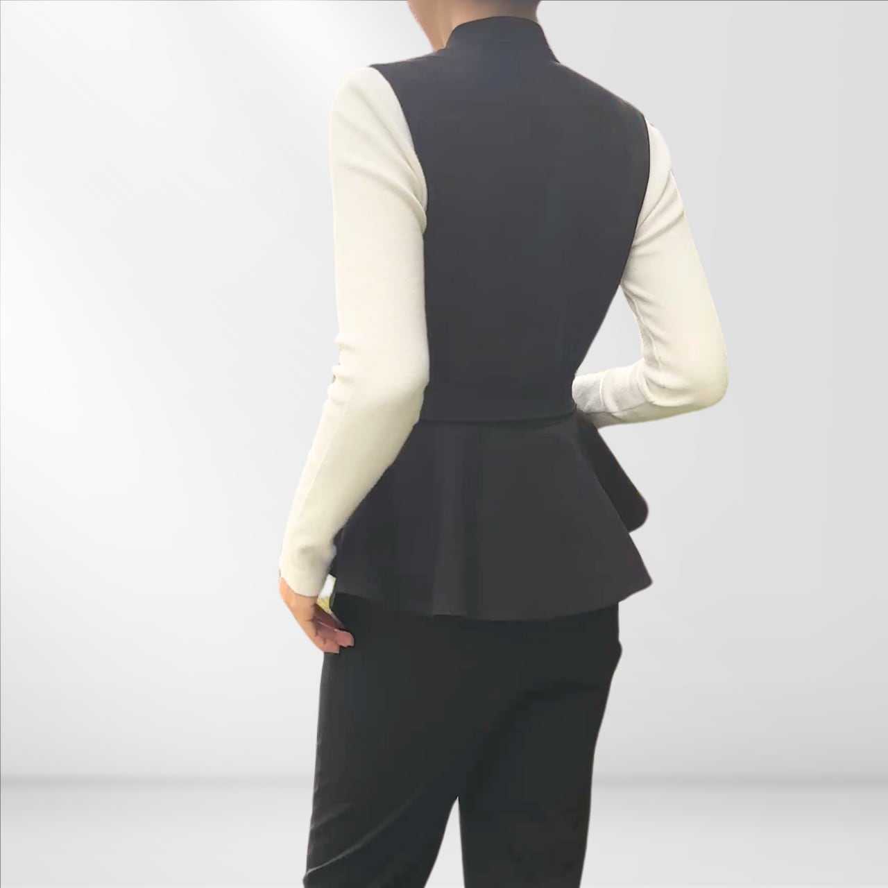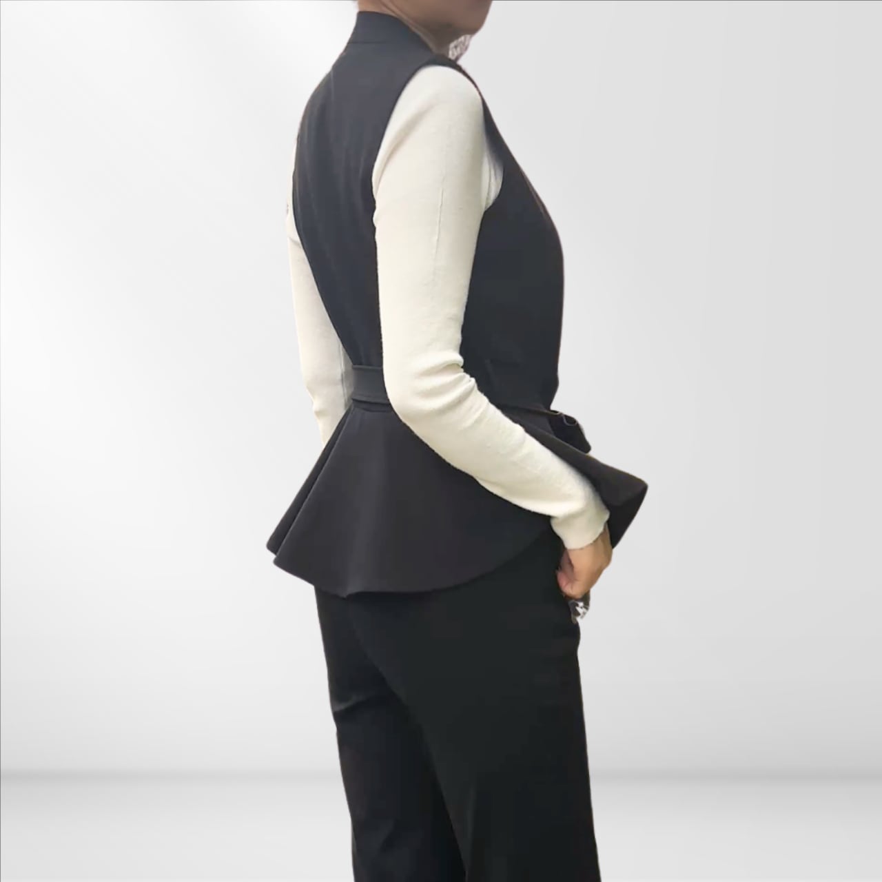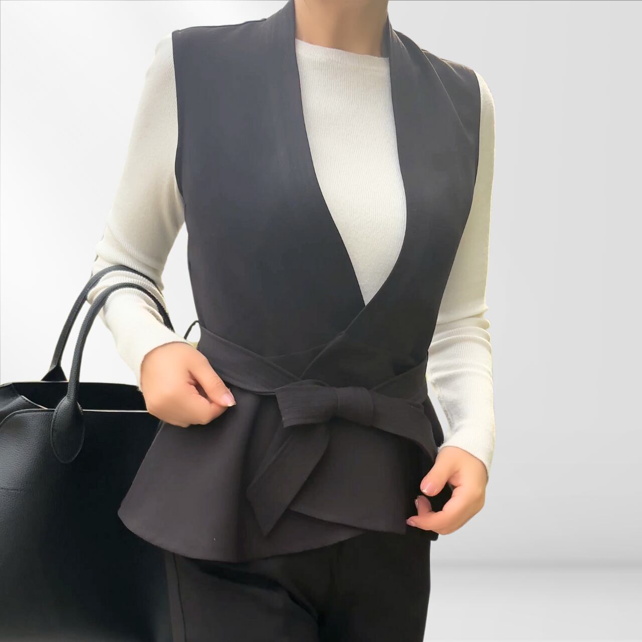 装いに立体感を添える、ウエストリボン付きのペプラムジレ。