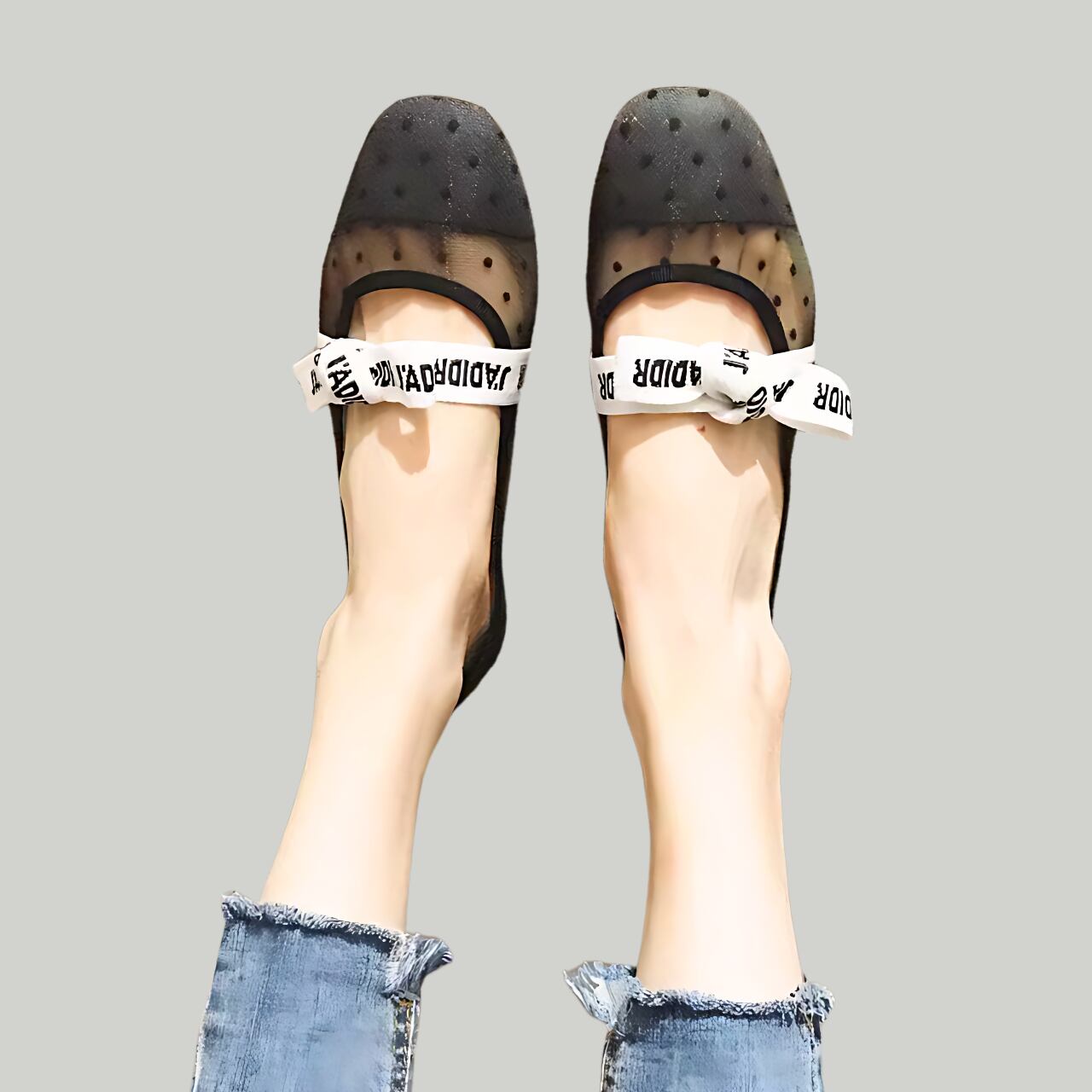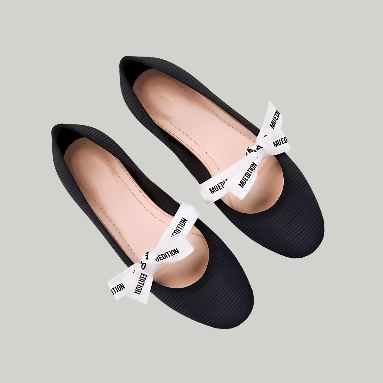 ロゴ入りのリボンが足元にさりげないアクセントを添え、