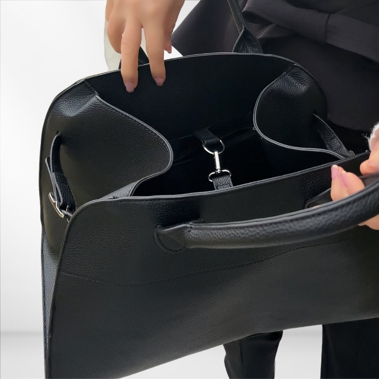 開口部には金具付きのストラップを備え、