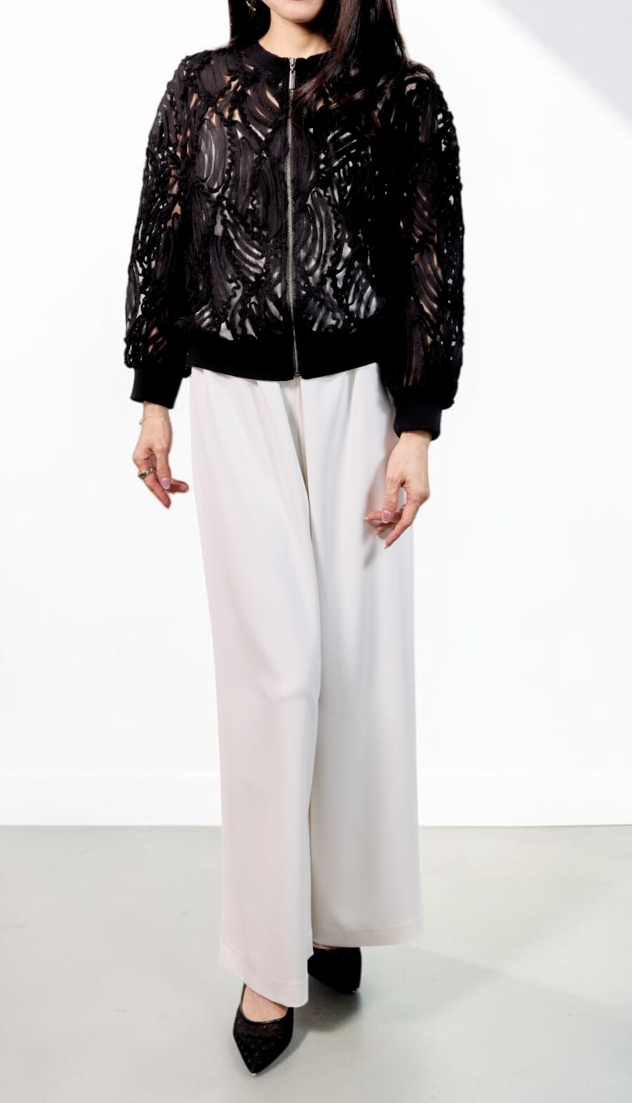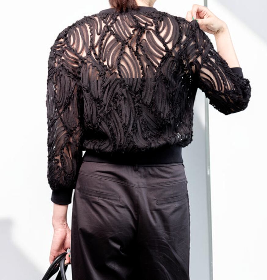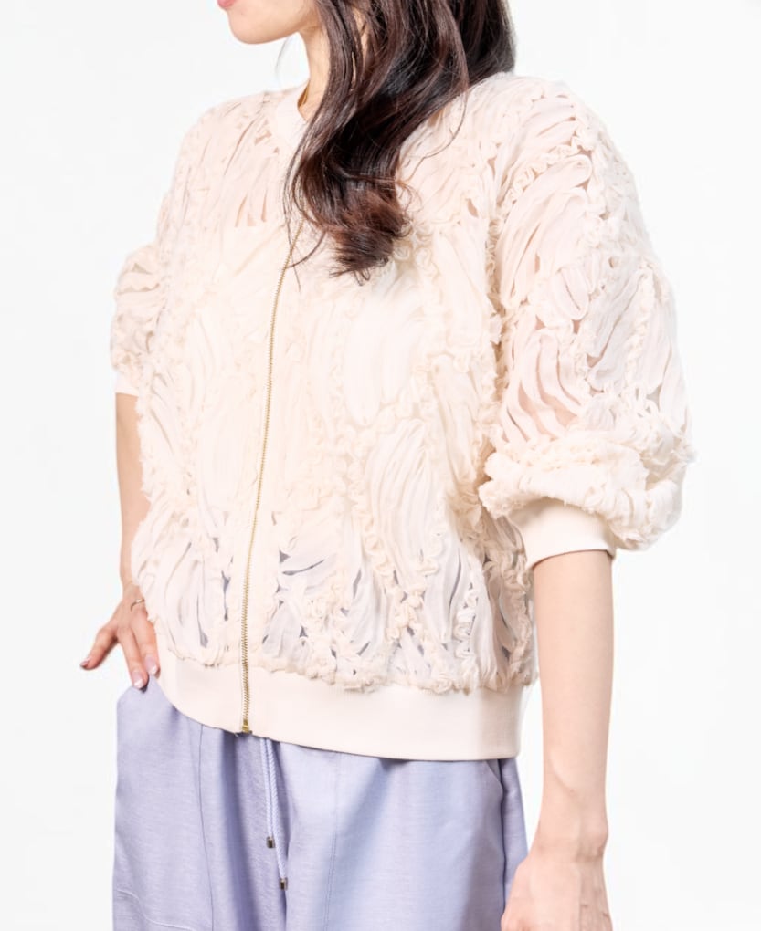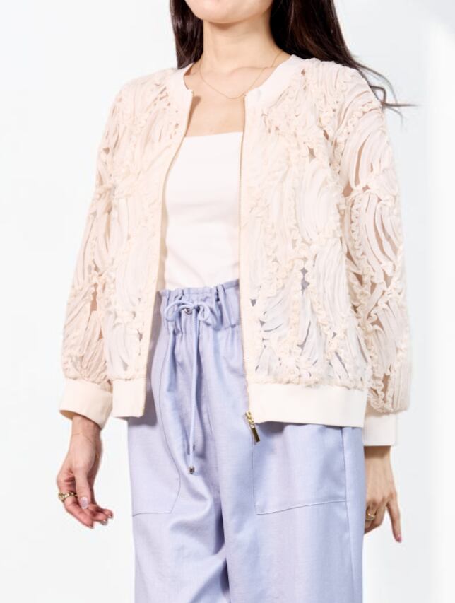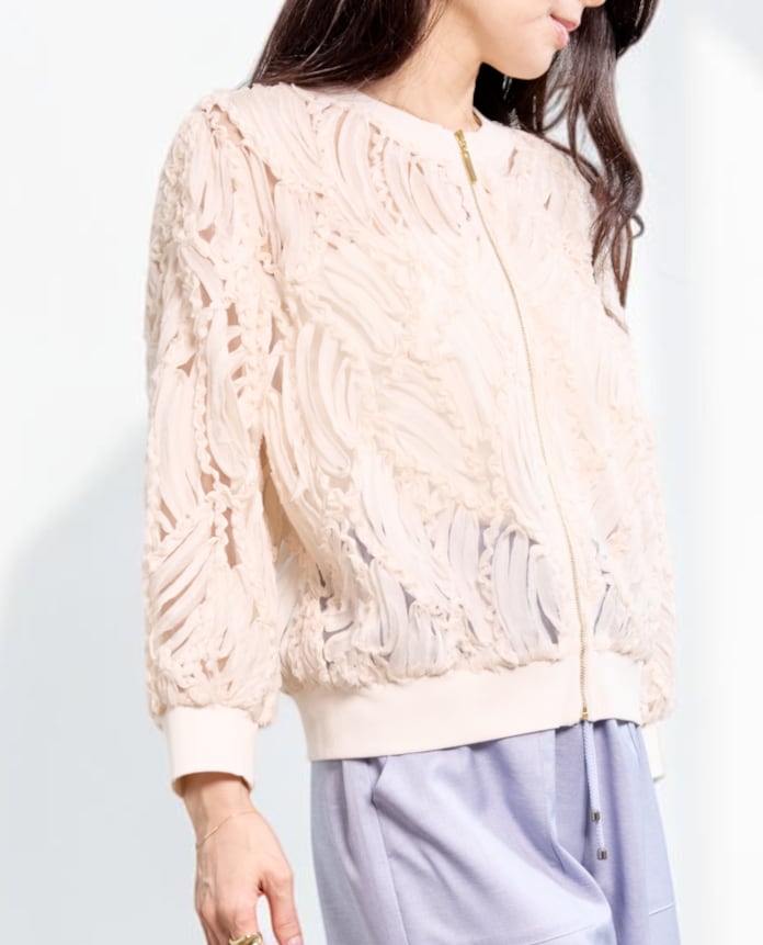 【送料無料】【Blue Fronce】【日本製】立体感のあるシアーリボン素材で羽織るだけで華やぐブルゾン|ジップアップ 軽アウター 手洗い可 羽織り きれいめ 大人カジュアル レディース 白 黒 ベージュ 上品 シンプル 30代 40代 50代 女性 春夏 通勤 お出かけ 学校行事 保護者会 デイリー オフィスカジュアル 高見え 透け感 華やか見え 美シルエット | VERYE(ヴェリエ)|きれいめセレクトショップ