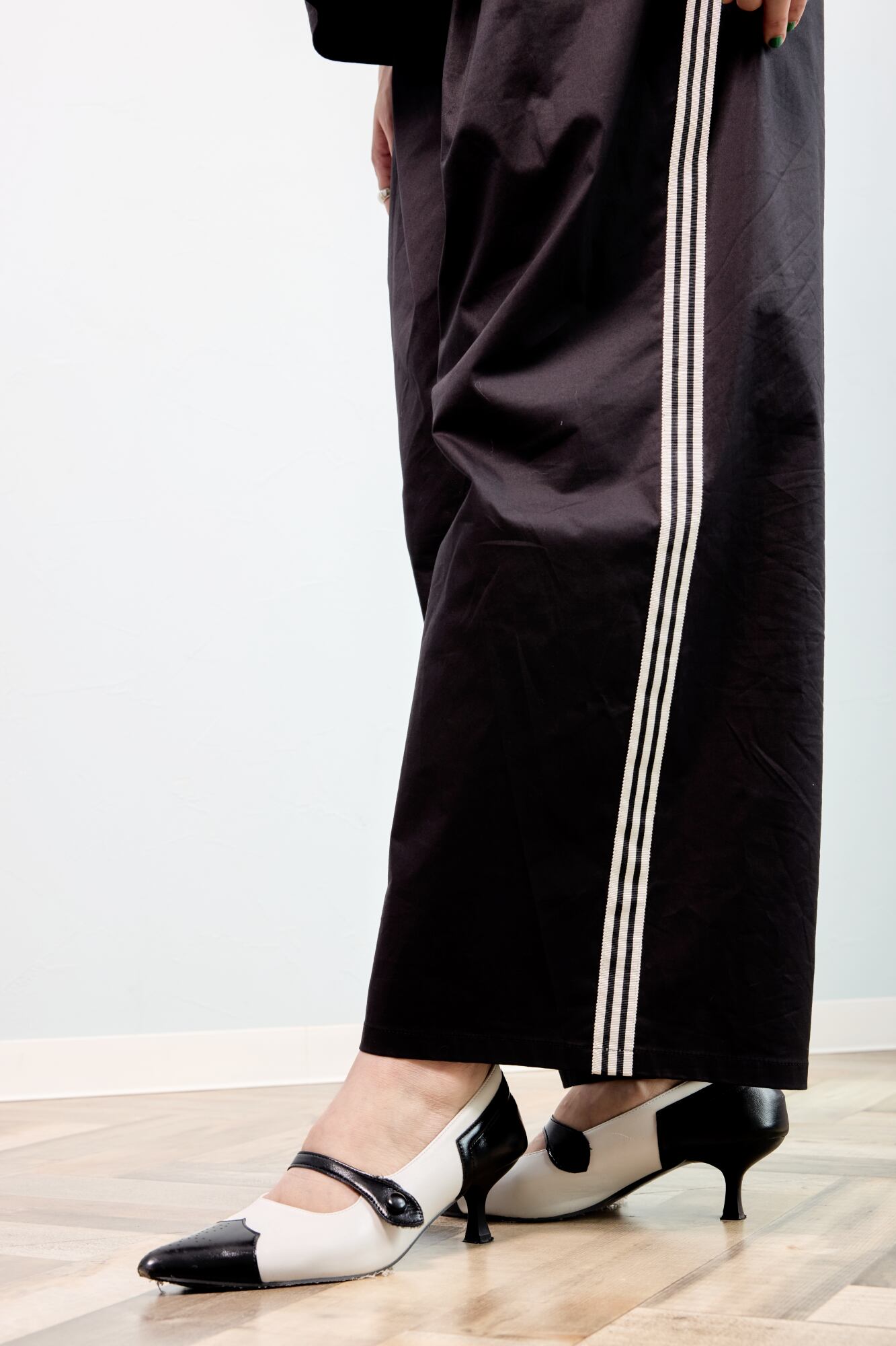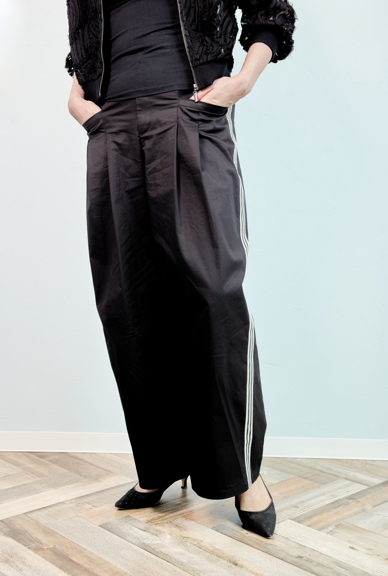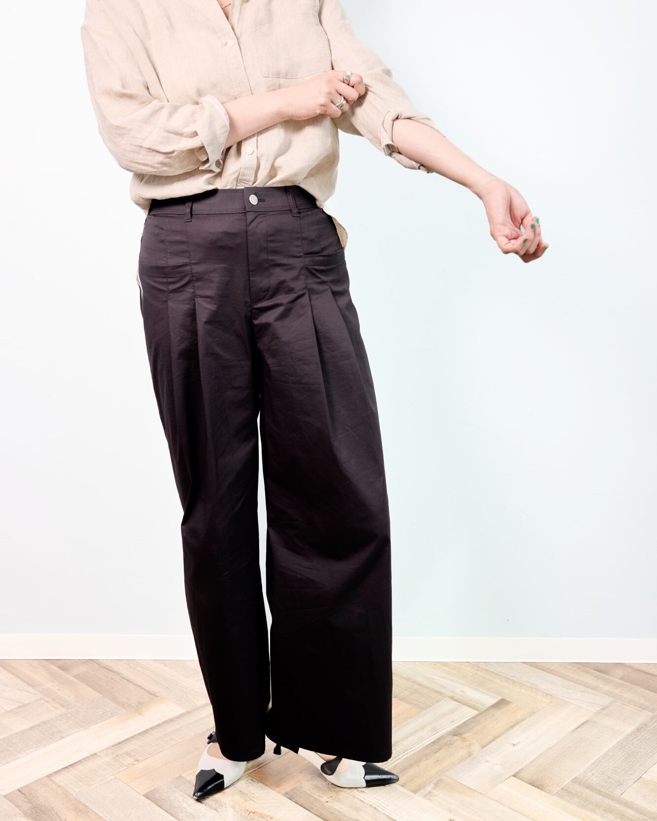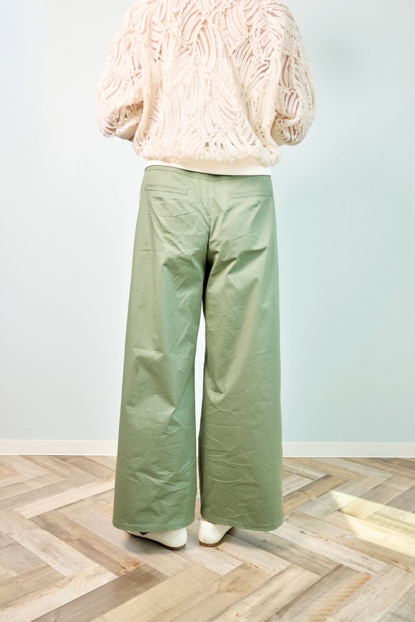 ほんのり光沢のある素材感とウエストタックが