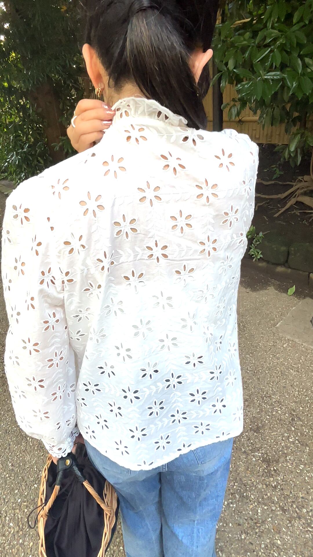 立体感のあるフラワー刺繍と、スカラップの縁取りが目を惹く、大人のきれいめブラウス。