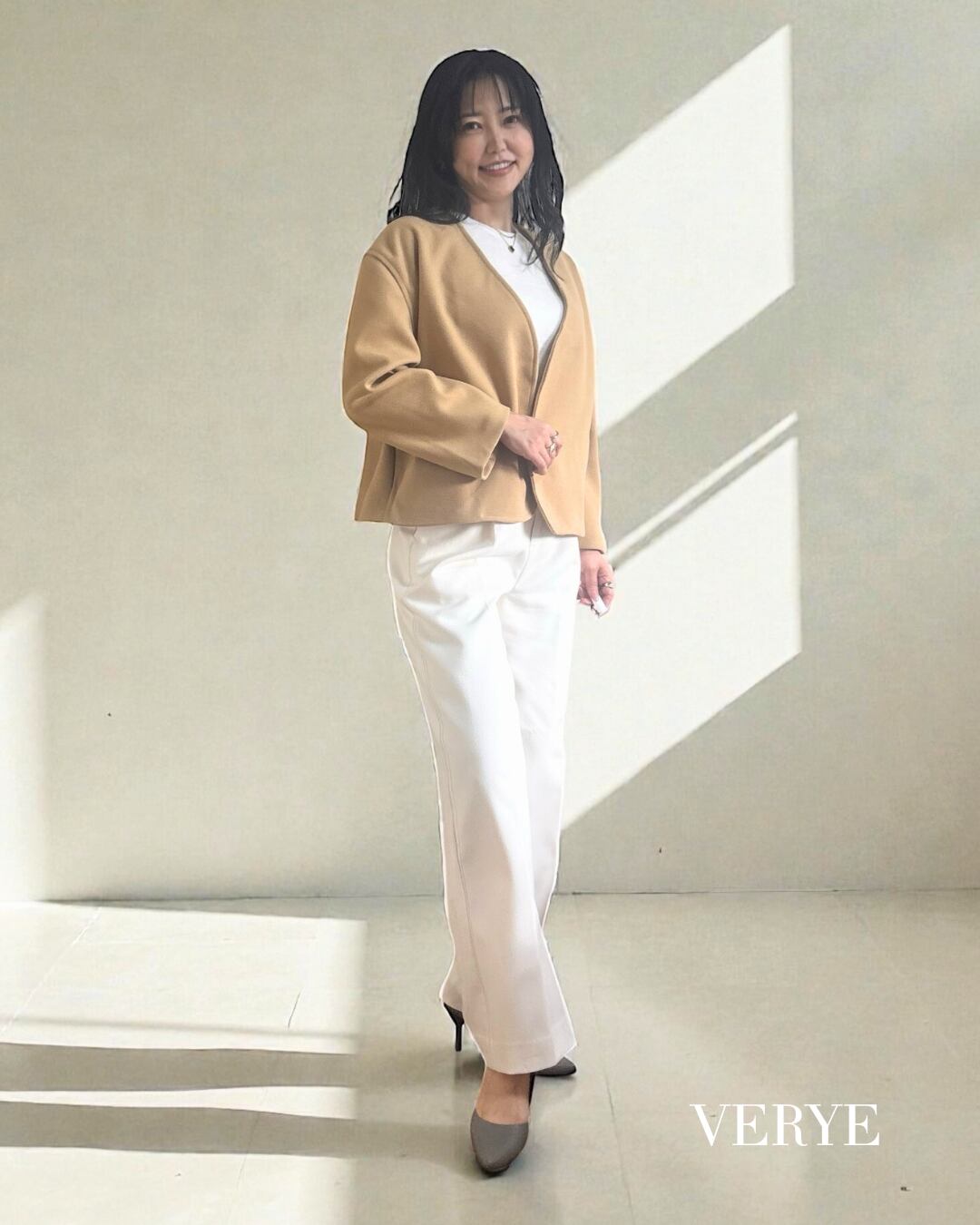 Vネックのノーカラーデザインが顔まわりをすっきりと見せ、